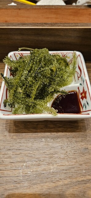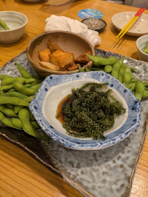 飲み放題2480円をオーダーして、料理はアラカルトでオーダー。ジーマミー豆腐とサーモンユッケ海ブドウ和え、もずく揚げをオーダー。