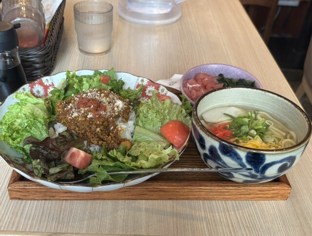 ゴーヤシャンプルー、ミニ沖縄そば、ごはん、小鉢がセットになった定食でした。