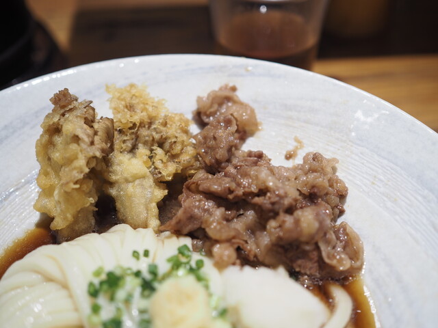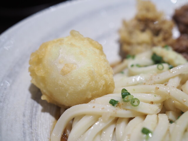 うどんは釜揚げうどん特有のふんわり、もちもちとした柔らかい食感と、表面のぬめりがいい。