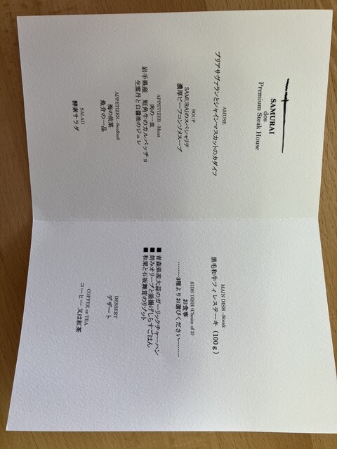会食で利用した「SAMURAI dos Premium Steak House」。入口では立派な甲冑が出迎えてくれ、店内は落ち着いた照明と個室中心のレイアウトで、とても静かに過ごせました。黒毛和牛のス...