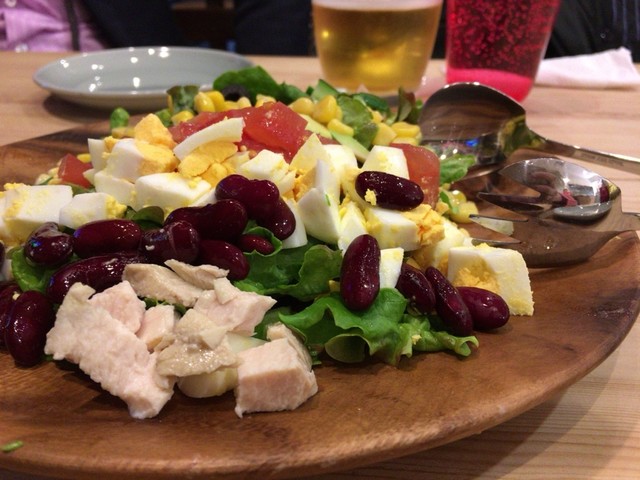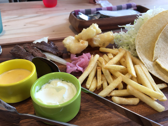 『都会の中の海辺のテーブル』をイメージしたビーチスタイルカフェの「ソルト ウォーター テーブル」。タコライスやサラダなど料理はカラフルで楽しさのあるメニューを提供。 |