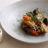 スターター、メイン2品、デザートをプリフィクススタイルでお楽しみください。 日本各地から取り寄せた旬の大地と海の産物を中心に使用し、素材そのものが持つ本来の味を守り、また穀物や野菜、フルーツを多く取り入れ、ヘルシーで地球に優しい料理をご堪能ください。