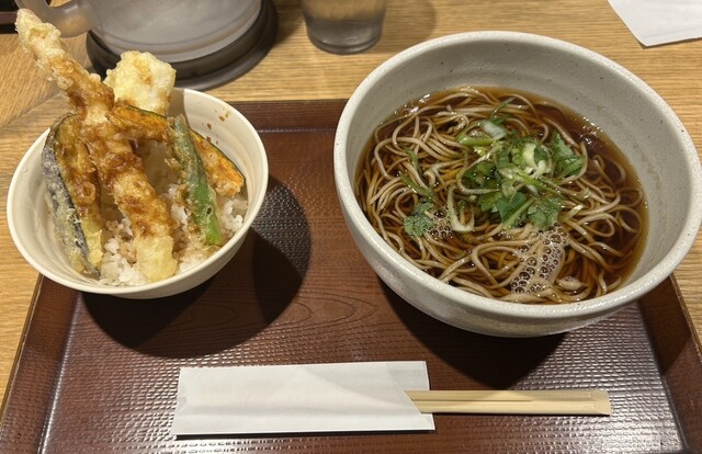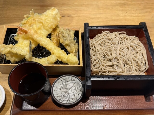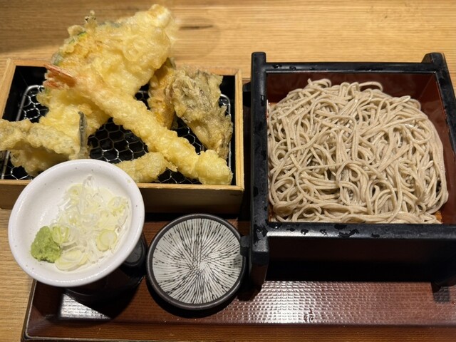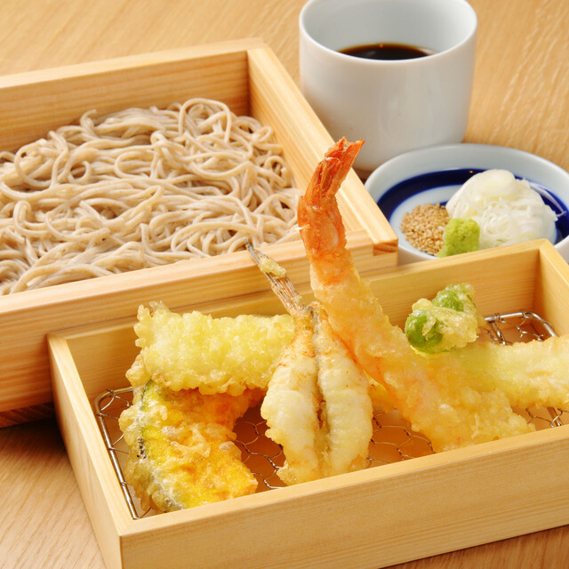 東京天ぷらを揚げる職人とゆでたての蕎麦のライブ感を観て食べてお愉しみください。
