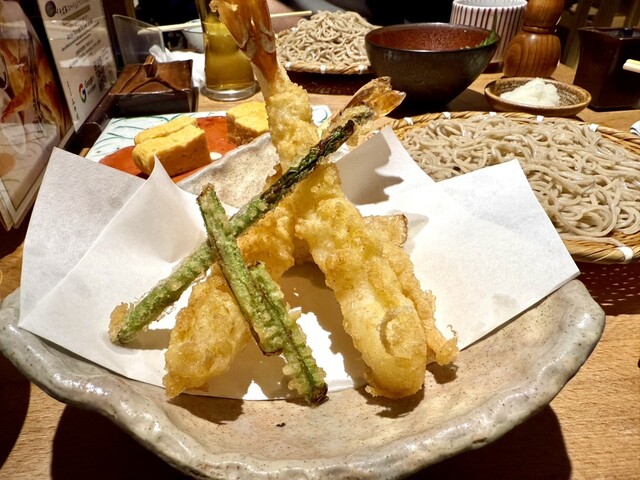 カリッと軽やかな衣と旬の野菜が、そばの風味を一層引き立てます。