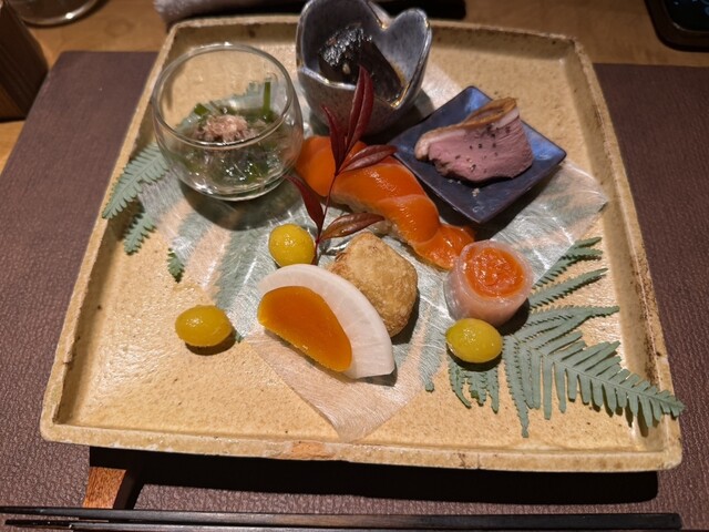 旦那の誕生日に、好物の甘鯛の松笠焼きを目当てに18,000円のコース料理予約し、平日のランチに伺いました。 カウンター席は私たちだけ。 カウンターの背後に個室が数室あるのですが、そちらはお客様が入ってました。 コース内容 【お椀】 涼麺(ジュンサイ、オクラ等) 【造り】 旬の特選鮮... 詳細を見る