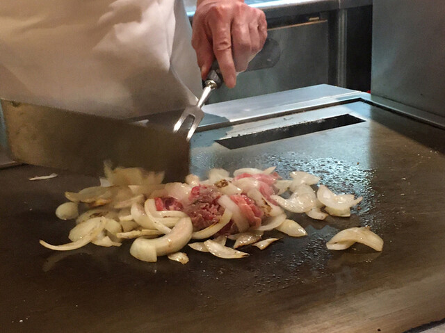 許可を得て作る様子を撮りました。玉ねぎが大量!1個分くらいあるんじゃないかしら。作り方が手早いけど丁寧で、食材を大切に扱っているのがステキ❤️カウンター席、サイコー✨