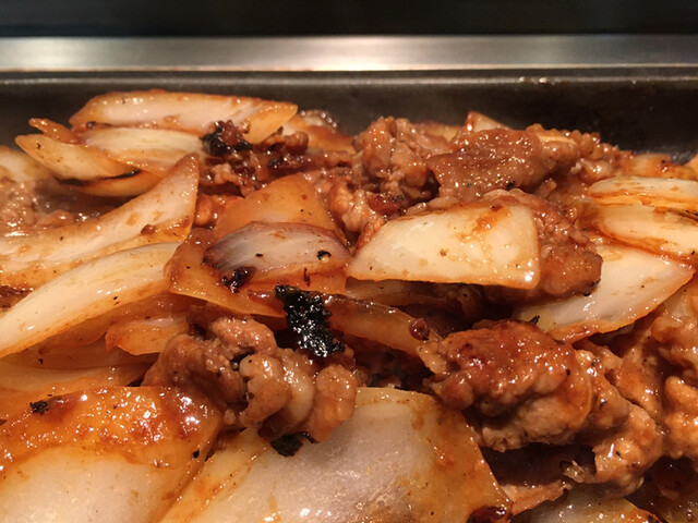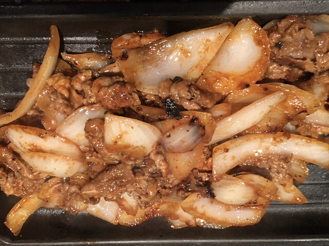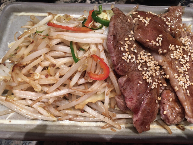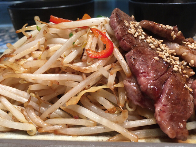 食べながら鉄板で焼く様子を見ていてびっくり。モヤシ炒めに入っているパプリカとピーマン、キャベツ、別々に火を入れ、最後にモヤシ投入。多分それぞれの野菜がちょうどよい状態にするためなんでしょうね。