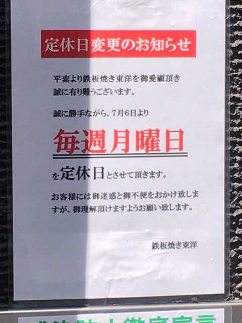 平素より鉄板焼き東洋をご利用いただき誠にありがとうございます。 |