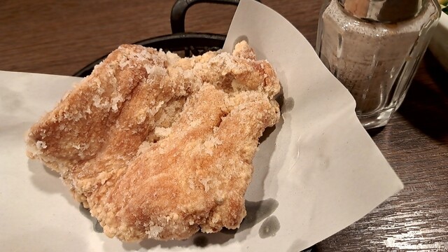 ★当店名物、大迫力の唐揚げは、1枚200円でご提供!サクサク食感に肉汁がジュワーっとあふれる一品は、ビールがすすみます♪