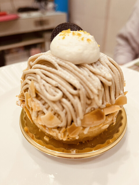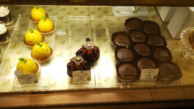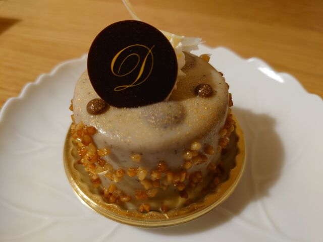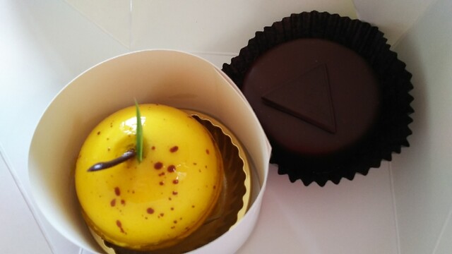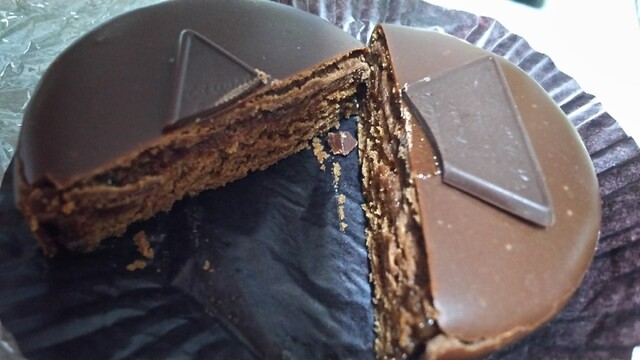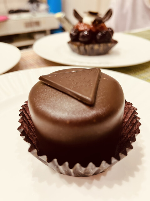 カヤヌマより直径少し大きめで高さがあり、縁は緩やかなカーブ。トッピングのチョコがのり、つやのあるチョコレート。見た目、綺麗で上品。