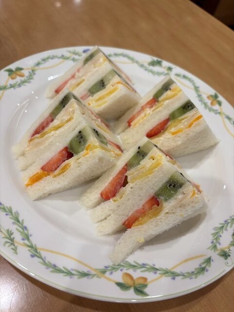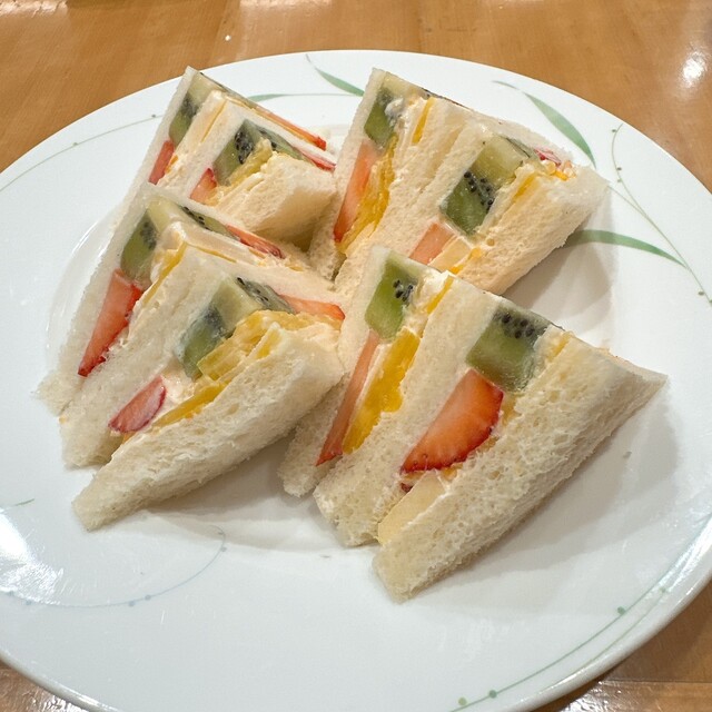 食事は5種のフルーツサンド、プレーンワッフル、千疋屋マンゴーカレーから選べて、私はフルーツサンドにしました。