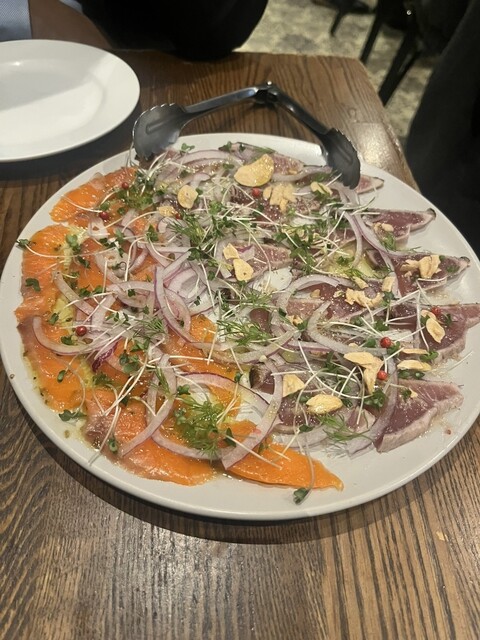 前菜盛り合わせ、サーモンのタルタル、トリュフのオムレツ、ステーキとワインを頂きました。