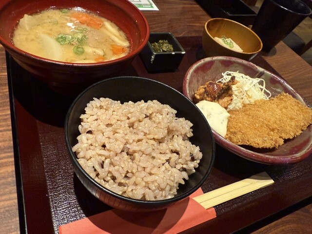 豚汁定食のおかずが白身フライと唐揚げのセット