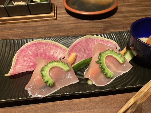 鹿児島、奄美大島、沖縄の料理での共通となると豚肉であろうか。此処でも甘辛く煮込んだ厚切りの豚肉が供され、上にゴーヤと辛子が添えてある。ラフテーに似た様なものだが肉に味付けがよくしゅんでおり、とても楽しめた。