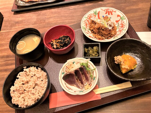 料理は、鹿児島、奄美大島(鹿児島であるので重複するが)、沖縄料理を提供する店である。この日の昼食も4~5つあったが、カツオのたたきと油淋鶏のセットの定食を頼んだ。鹿児島は枕崎のカツオが極めて知名度が高いからだろう。セットにしたが為にカツオのたたきは僅かに3キレと少ないのが難点だが、反面、油淋鶏は大振りなものが2つ有り、その他の沿え物としてかぼちゃの炊いたものに肉そぼろを和えたものに、ひじきが付く。当然に味噌汁、ご飯は言うまでもない。此れで1,100円だったか・・・ 良心的である。