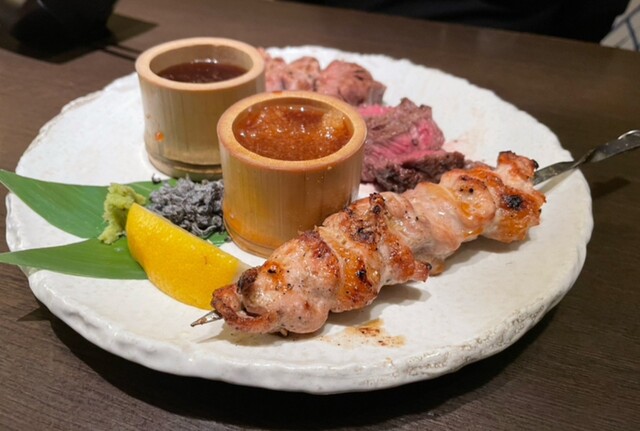 〇ステーキと焼き鳥の盛り合わせ