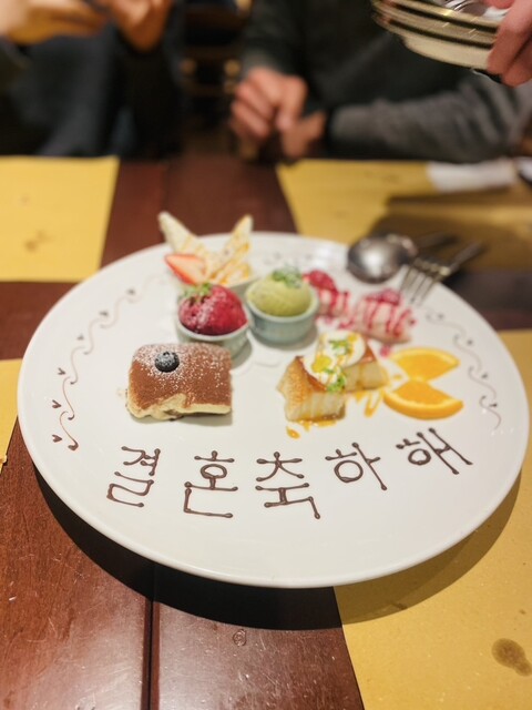 30代女性2人、男性2人でしたが、十分な食事量でした。(女性2人はパスタでもうかなりお腹いっぱい) そして、何より感動だったのはお祝いのプレート日韓カップルの結婚祝いのプレートで、漢字とカタカナでご依頼したのを、見事に韓国語に書いていただきました。2人とも大喜びで、すごくいいプレゼントができました!!!しかもプレートのどれも美味。4人とも「素晴らしいお店」と言う言葉が自然とでましたね。ありがとうございました!!!また行きます