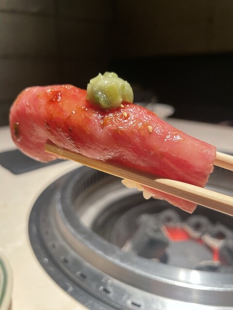 添えてある山葵と一緒に。肉のうまみと脂の甘さに悶絶。贅沢すぎるひとくち。