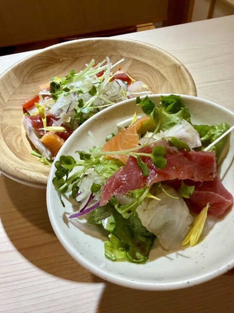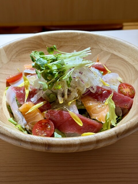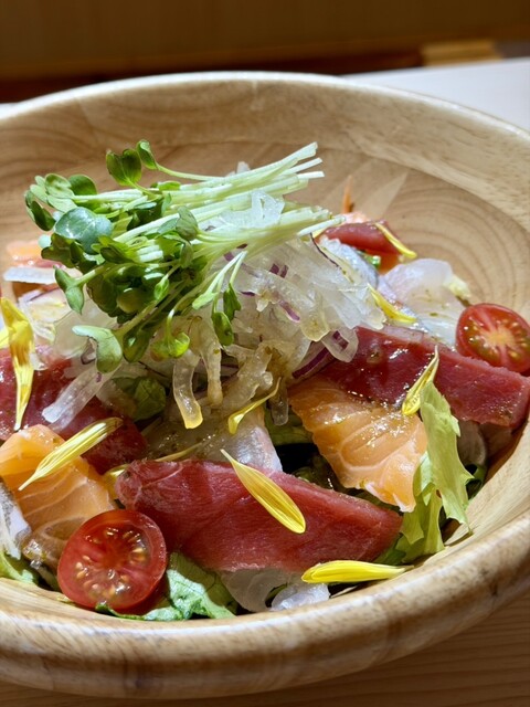 『御岳コース-おたけ-』 本日の先付けに始まり、蕎麦の実と芽を使ったヘルシーサラダで軽やかに。豊洲直送の極上刺身、香ばしく焼き上げた九州地鶏のクワ焼きに、ぷりぷり海老のフリッターを堪能。〆は鮭ハラスの旨味が広がるチャーハンで、満足感のある内容です。 ※水木金・祝前日は2時間制