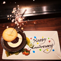 【大切な日にアニバーサリーコース】 通常のコースに加えて、乾杯スパークリング、デザートプレートのアップグレード、食後のカフェが加わったお得なコースになります。 季節の彩りをお料理に映した前菜から始まり、常識を覆す魚と呼ばれた旨味が抜群のくぬぎ鱒の鉄板焼、部位が選べる厳選黒毛和牛ステーキなど、肉も海鮮もたっぷりとお楽しみいただけます。 デザートプレートにはご希望のメッセージを添えることができますので、誕生日や記念日など、おもてなしの席にぜひご利用ください。(メッセージは20文字前後でご記載くださいますようお願いします。) 食後にお選びいただけますカフェはノンカフェインタイプもご用意。