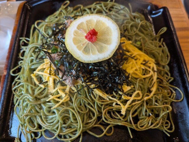 注文したのは「瓦そば」と20食限定の「山口まぜご飯」のセット。熱した黒い瓦に茶そばが豪快に盛られ、見た目からインパクトが強い。瓦の上で麺がじわじわと熱せられ、ところどころパ...