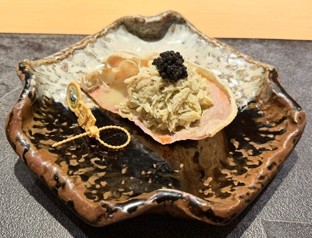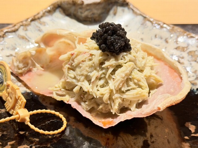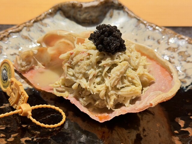 いきなりタグ付きのズワイガニの身が甲羅にどっさり!キャビアもどっさり!何だか凄い始まりです