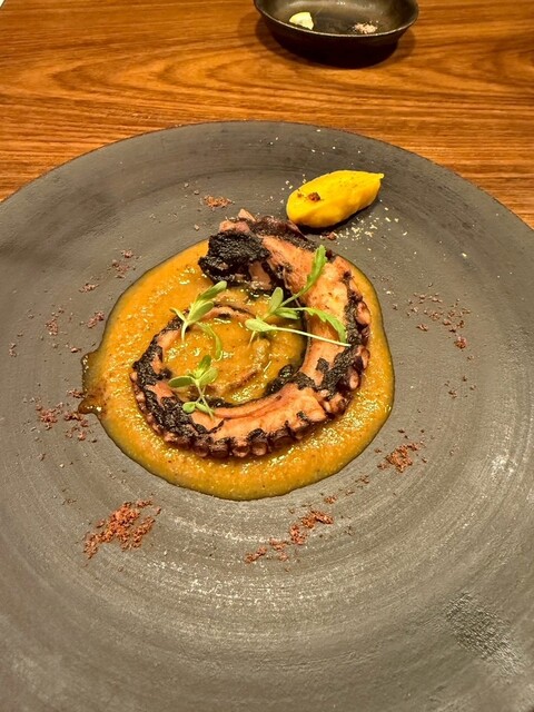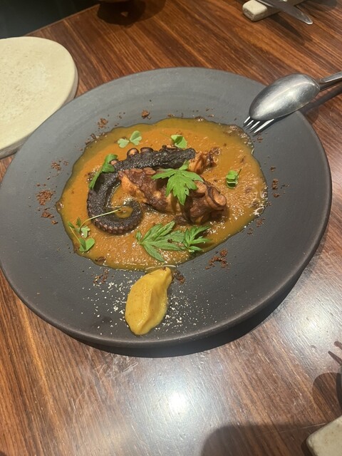 テーブルの上に置かれた黒い皿の上で、タコの足が静かに横たわっていた。
