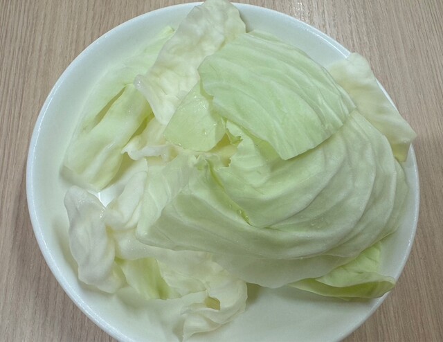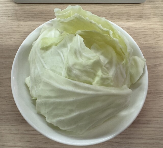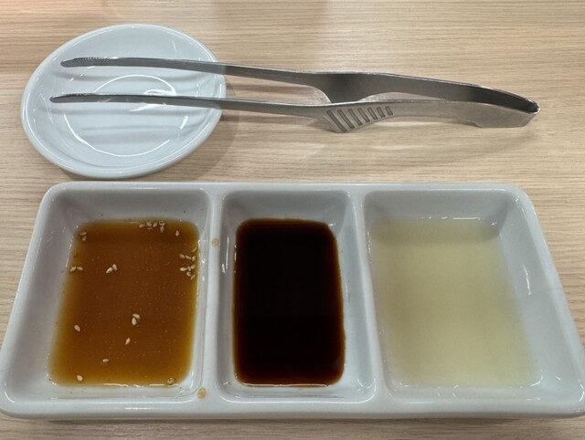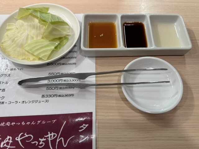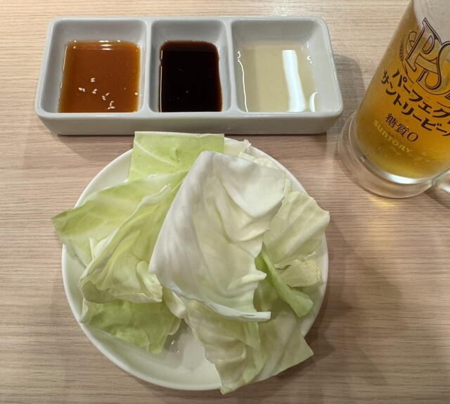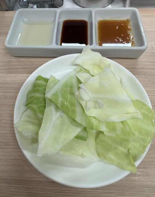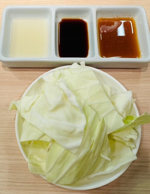 まずはお通しの生キャベツが、タレ、醤油、レモン果汁とともに、提供されました。トングも一緒に。