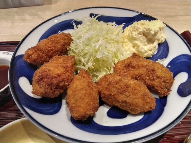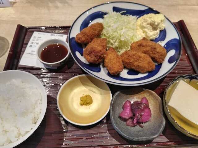 センターの大テーブルの端っこに陣取って、カキフライ定食を。おでん3種にも惹かれましたが、今日はカキフライです。