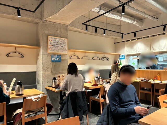 店内は左右にフロアがあり、通された右手はキッチンと30席ほどのワンフロア。コンクリート調に明るい木目を組み合わせた綺麗...