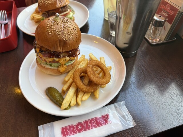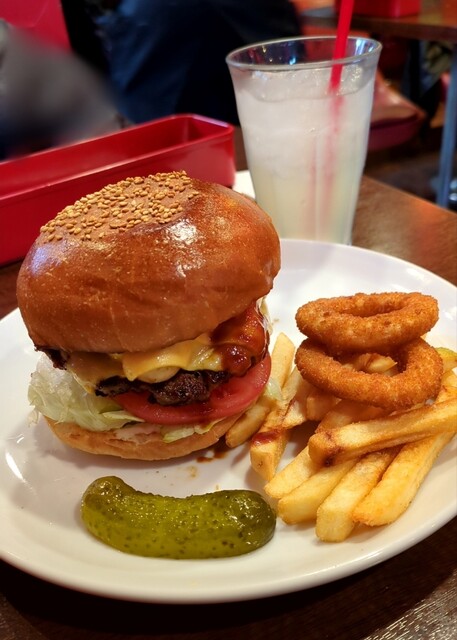 バンズの焼き加減が絶妙で、最後まで崩れず綺麗に食べられるのも流石の名店。サイドのオニオンリングがサクサクで、ピクルスが別添えで付いてくるのも嬉しいポイント。バニラシェイクは量が多く飲み切れませんでした。