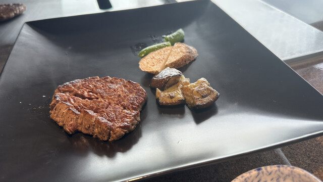 「ステーキ食べ放題」コースを利用。食べ放題でありながら、熟練のシェフが目の前の鉄板で焼いてくれる贅沢なスタイルです。