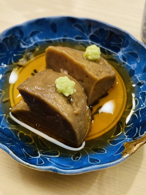 あん肝:柔らかく、甘辛く炊かれ、陽乃鳥と合わさることで甘味や塩味の角が取れ、膨よかな旨みが口内で溶解する逸品。