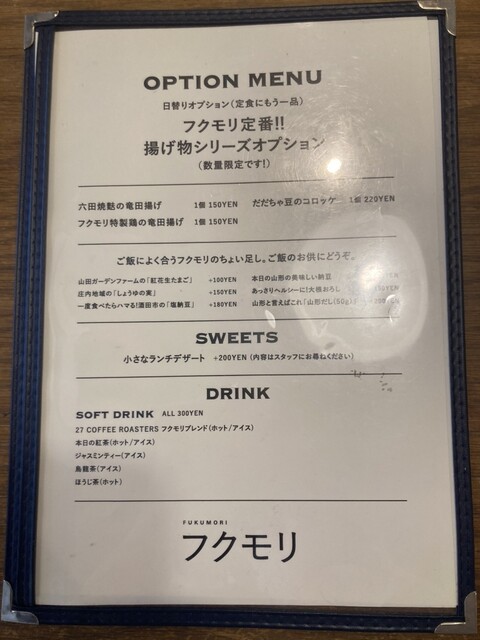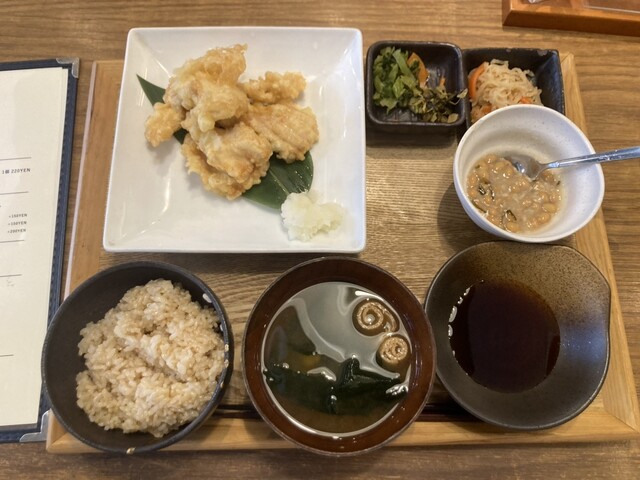 今回いただいたのは3月のフクモリランチ(1200円)と、ご飯のお供に酒田市の「塩納豆」(150円)を追加。メインは日替わりのようで、訪問した3月の木曜日の肉メニュー「ふんわりジューシー!東北あべどりの天ぷら」をチョイスしました。ご飯は白米と玄米から選択可能・おかわり可能です。