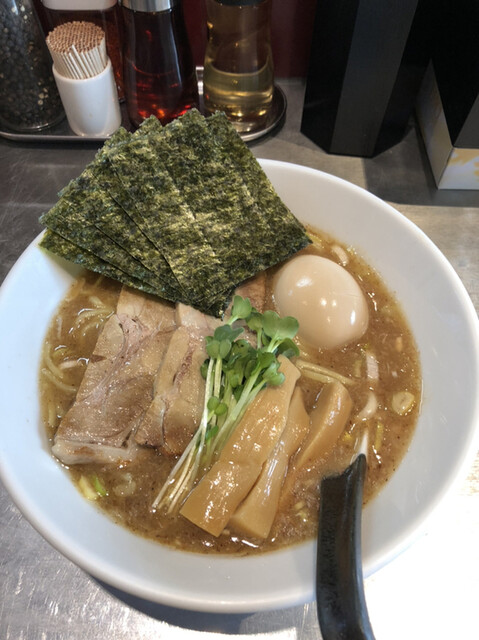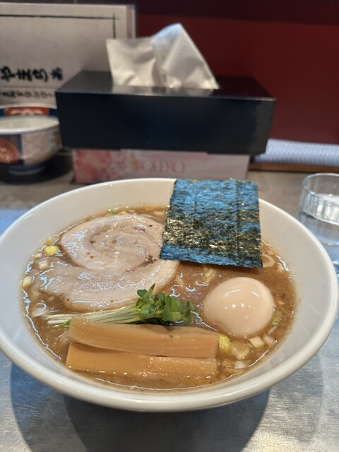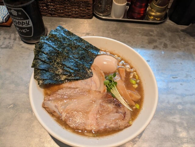 平日夜普段は混んでいて入れないがこの日は幸か不幸か雨で空きがあり入れた。特製しょうゆ全部入りとホッピーセットの食券を買い、指示に従い奥の席へ。先客は居酒屋ノリで盛り上がっておりにぎやか。麺はチャーシュ...