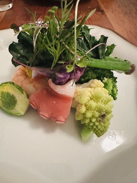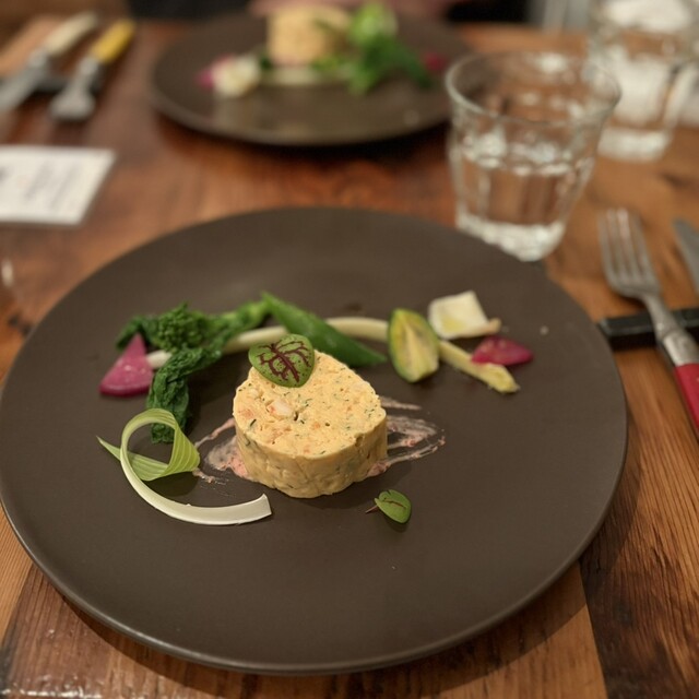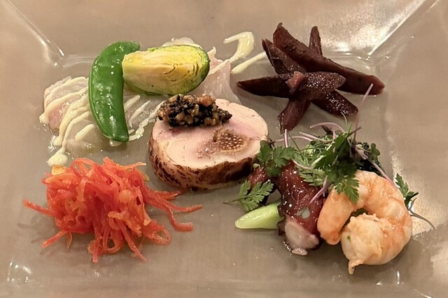 「ゴボウと蓮根の赤ワインきんぴら 胡麻油の香り」、「季節の彩り野菜のテリーヌ」、「お魚のカルパッチョ」、「骨付き鴨モモ肉のコンフィ」、「グラタン」等を注...