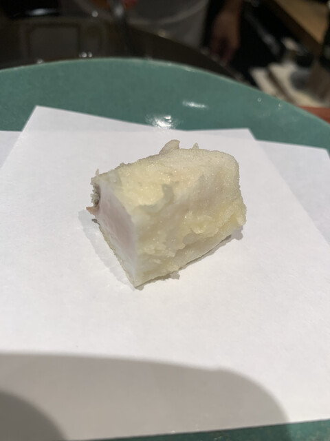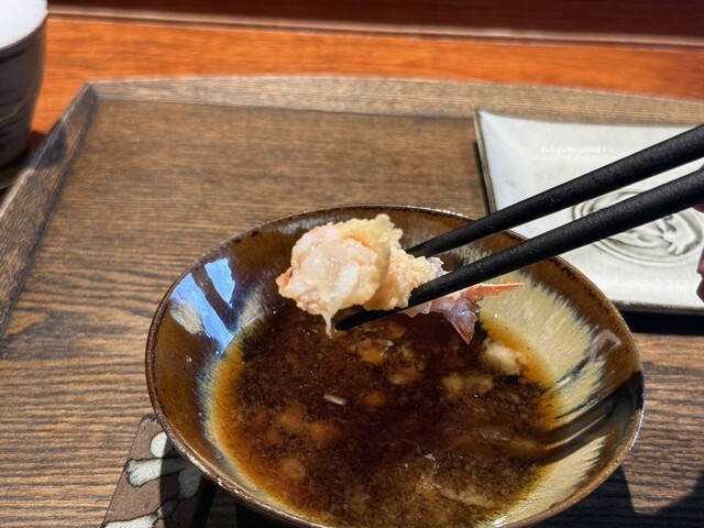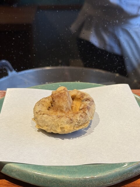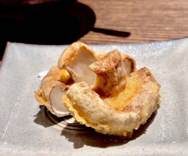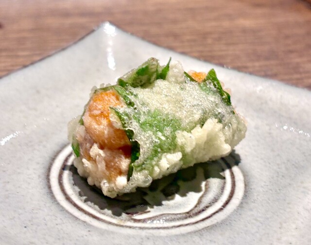 ドレッジを使って、衣を極限まで薄くし、じっくりと揚げた香ばしくてトロト口の茄子。パリパリとトロトロ具合が素晴ら...