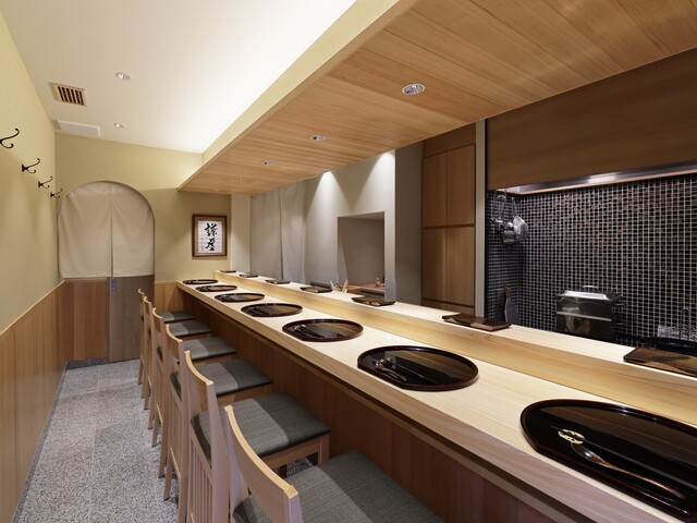 内装は、横一列のカウンター席、七席です