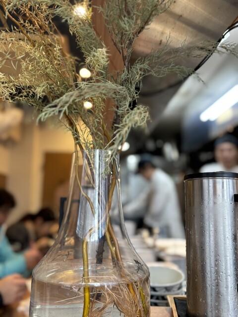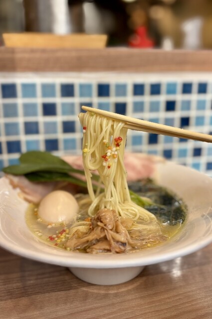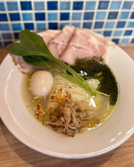 平日13:10、ちょうど私で満席。この時間でも待つ可能性ありですね。 シンプルに蛤出汁のしそ塩そば1100円を注文。 4人麺待ちでしたが、10かからずに着丼。 まず、美しい! 麺の姿も、スープに緑のしそオイルの色彩感覚も素晴らしいですね。 スープは蛤の旨味がとても濃厚でありながら、雑味... 詳細を見る
