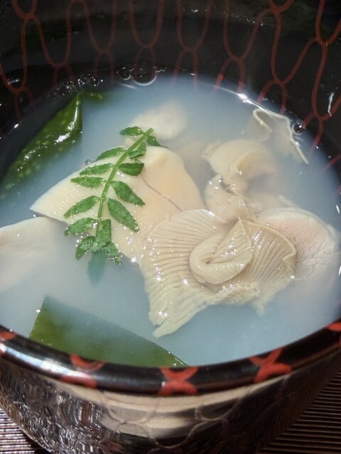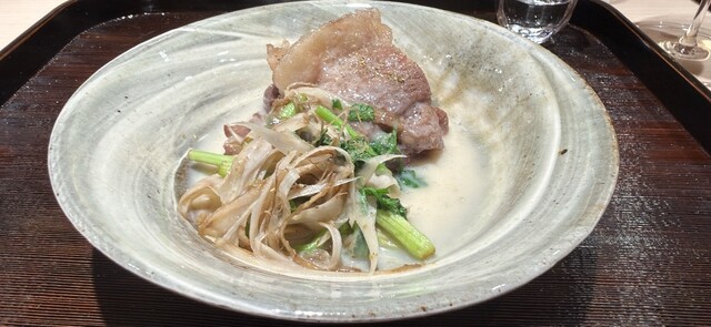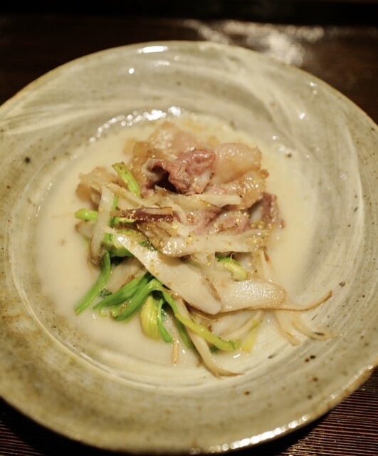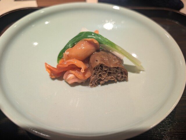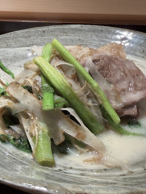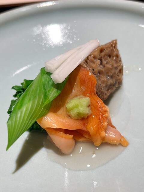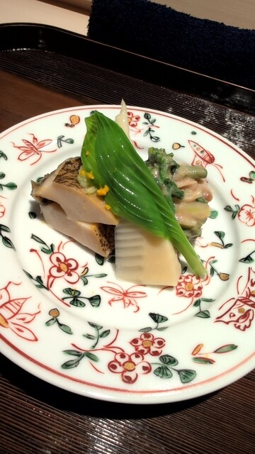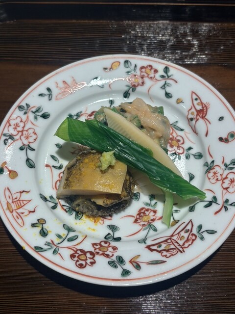 ウルイと筍の下に蒸し鮑と松の実和え。単品でも美味しいけど、松の実和えが抜群に旨い!筍は藤枝産。