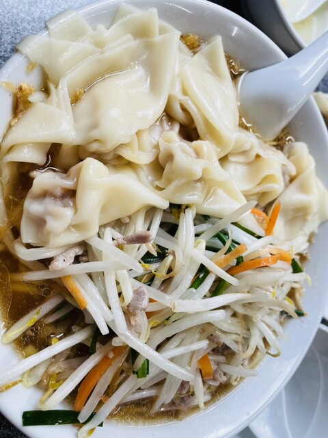 もやしワンタン麺はスープはあっさり、中太麺、ワンタン、もやしはどっさりボリューミー。
