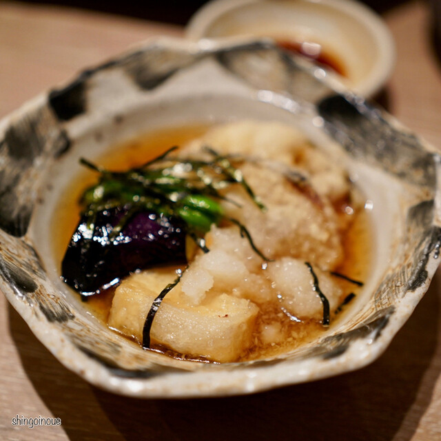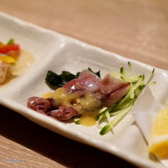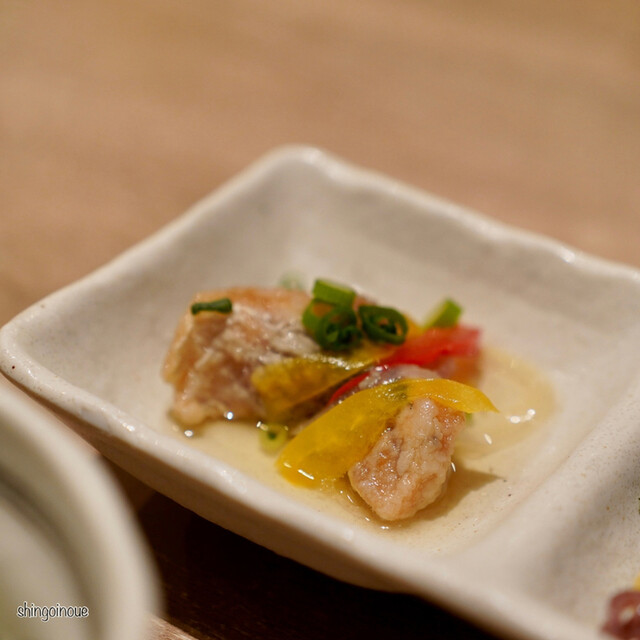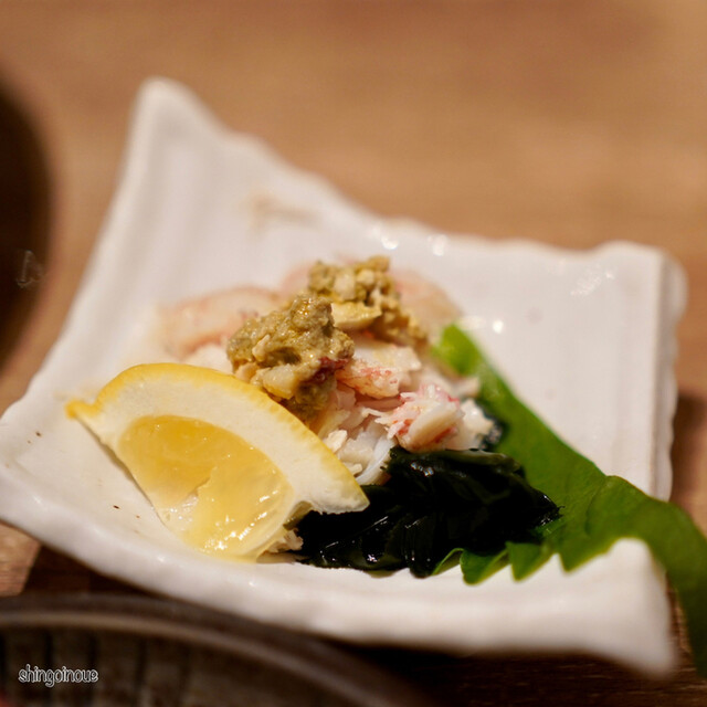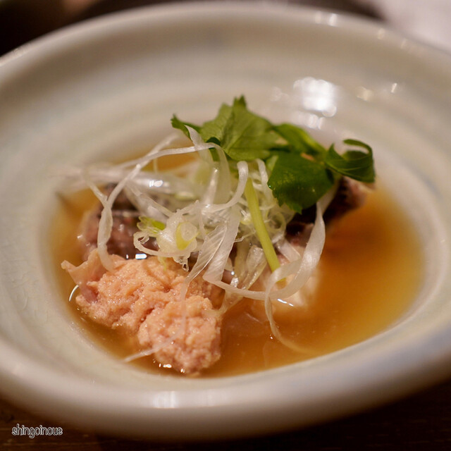 道玄坂を少し登った先にある店は、いつものように活気に満ち溢れています。カウンター席に案内され、まずはビールで乾杯。コースはお通しの煮こごりからスタートし、続く刺身の盛り合わせで、早くも「魚真」の本気を見せつけられま...