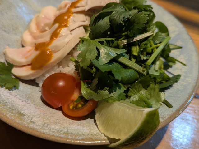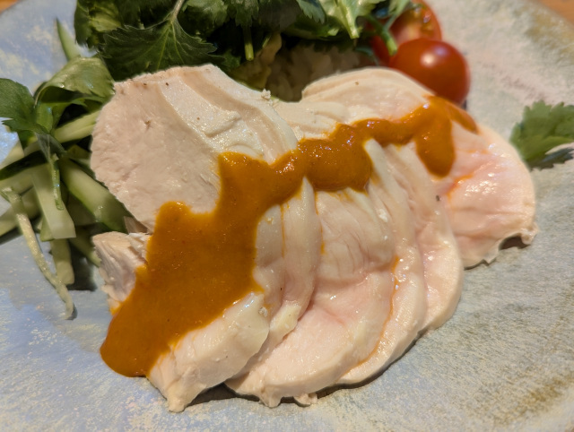 柔らかくジューシーな鶏胸肉にお手製チリソースがクセになる味わいの大山鶏のあったかカオマンガイ
