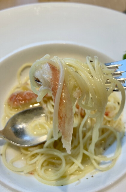 この日は、パスタは桃と蟹の冷製パスタと赤魚といぶりがっこのパスタ。どんな味かわからない桃と蟹の冷製パスタにしました。