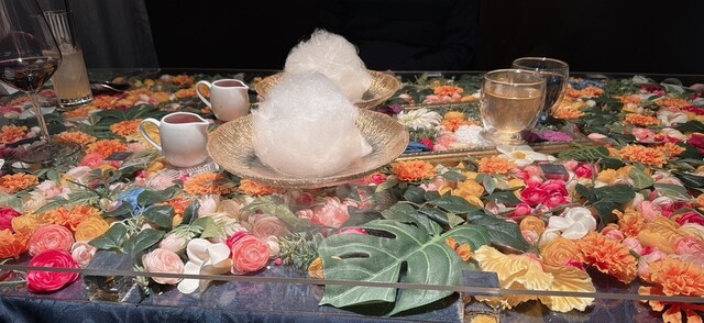 デセール提供前にテーブルクロスをとって、フラワーテーブルが現れる演出付き