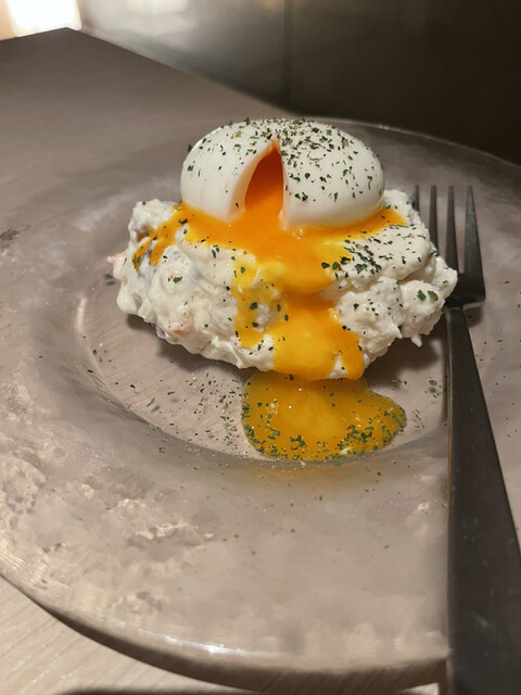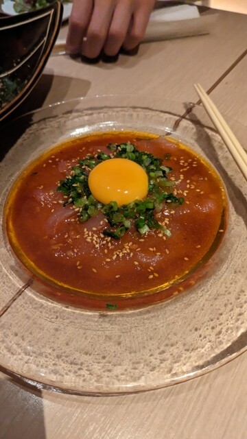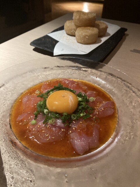 最初の びんちょう鮪ユッケカルパッチョ は黄身を絡めて濃厚で贅沢な味わい。