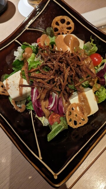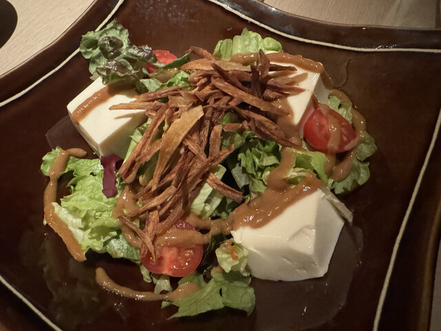 金胡麻サラダ は卓上のすり鉢で炒りごまを自分ですってかけるスタイルで、香りが立って楽しい演出でした。