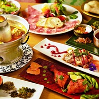 渋谷駅直結、【モヤイ像】を彫り上げたアート集団が手がけた「トムボーイ 渋谷道玄坂店」。インパクトある装飾も見どころの店内では、五つ星ホテルで技を磨いた一流シェフが作り上げる多国籍料理がを味わうことができる。スパークリングワインも選べる飲み放題3時間付きのコースは、イクラのせ海老入り具だくさん生春巻きや鉄板炭火焼き黒毛和牛ステーキに加えて、シーフードのガパオにサルシッチャソーセージとキノコのピッツァと続く全11皿。スパイシーな料理や豊富なドリンクとともに、異国情緒を味わって。
