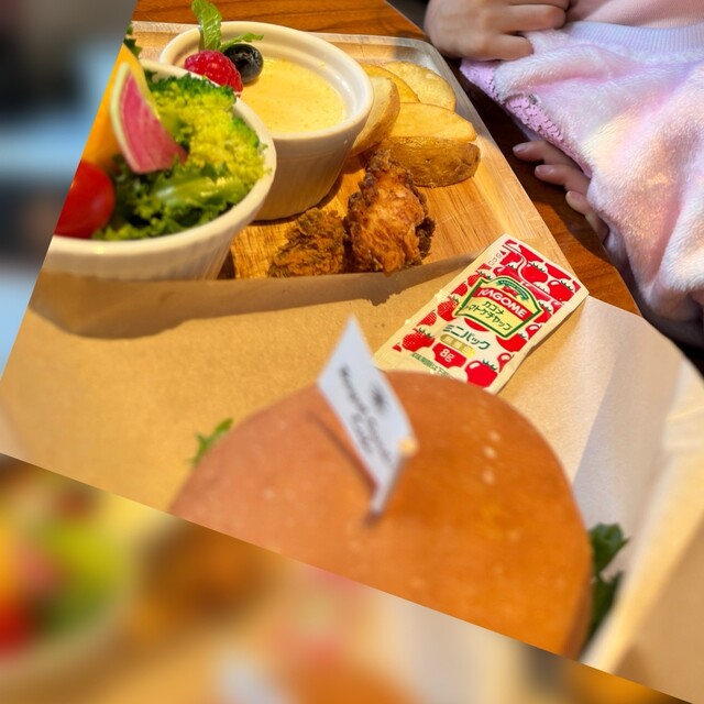 親子3人で訪問。子どもにもとってもフレンドリーで居心地が良いです。写真はお子様のバーガーセット。4歳娘も喜んで食べてました。サラダも。大人は、スパゲティセットとバーガーセット。どちらもヘルシーな感じ。...