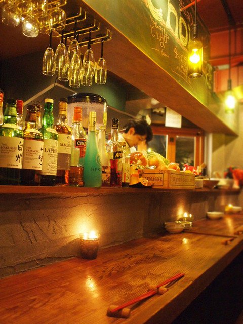 渋谷の喧噪を離れた裏代官山の小さな抜け道の途中にあるお店。赤提灯が目印。古い材木屋さんを改装した店内はどこか懐かしい雰囲気で落ち着く空間。